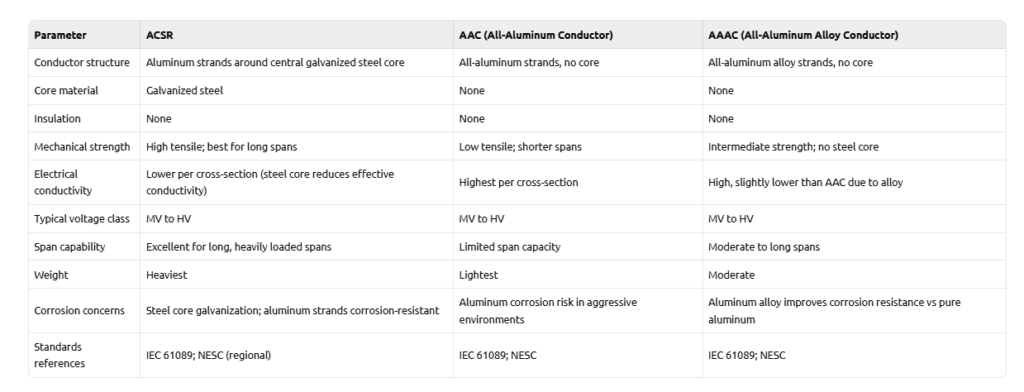 ACSR, AAC, and AAAC each serve distinct roles in overhead power transmission and distribution.