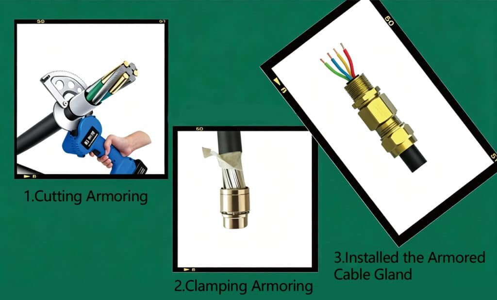 Choose armor-rated glands/connectors; confirm termination kits support the armor type.